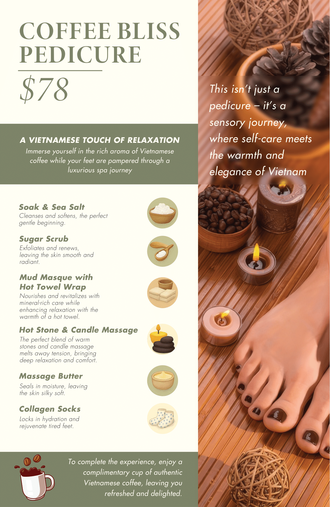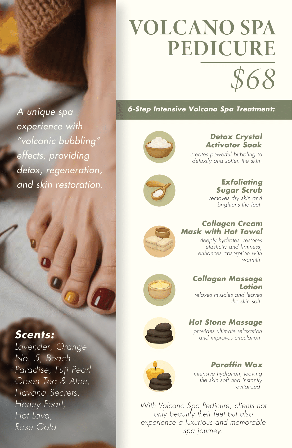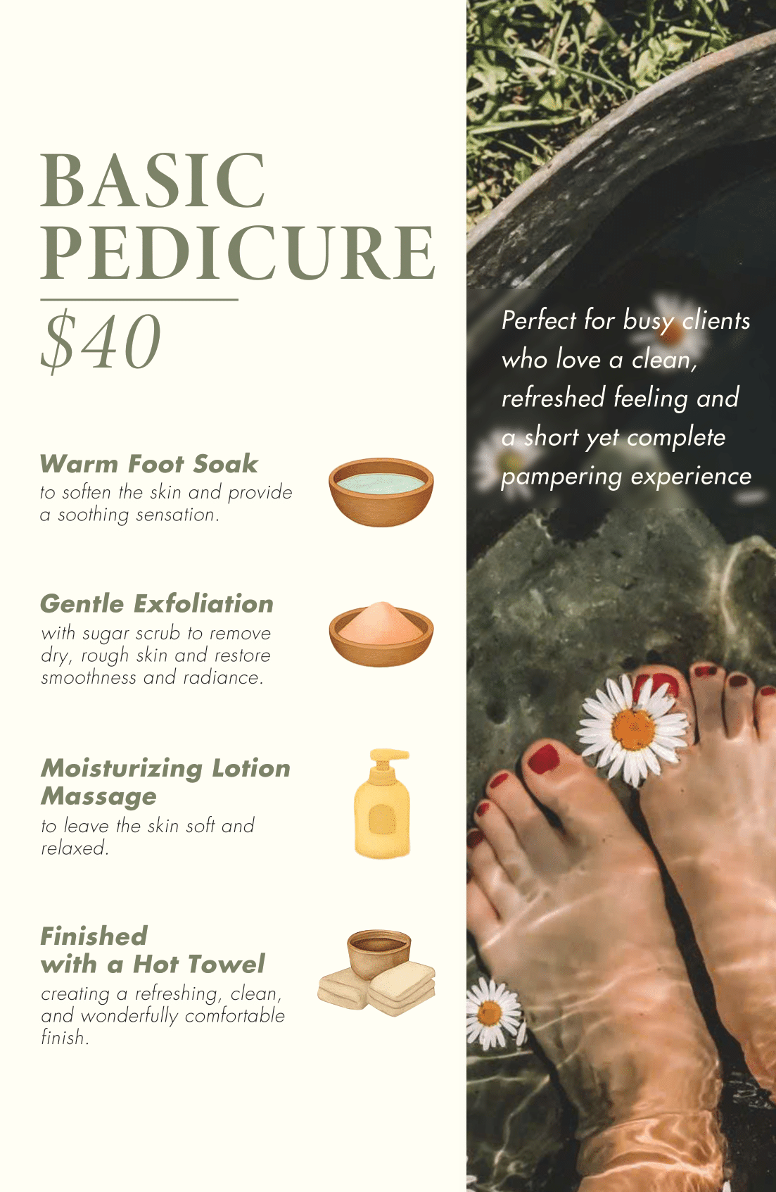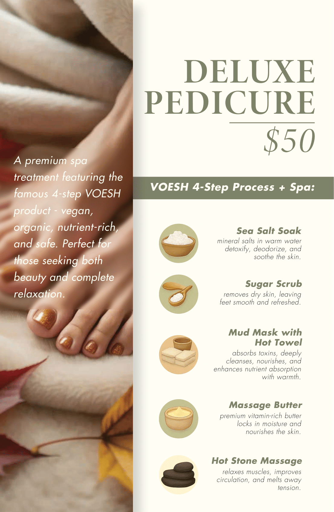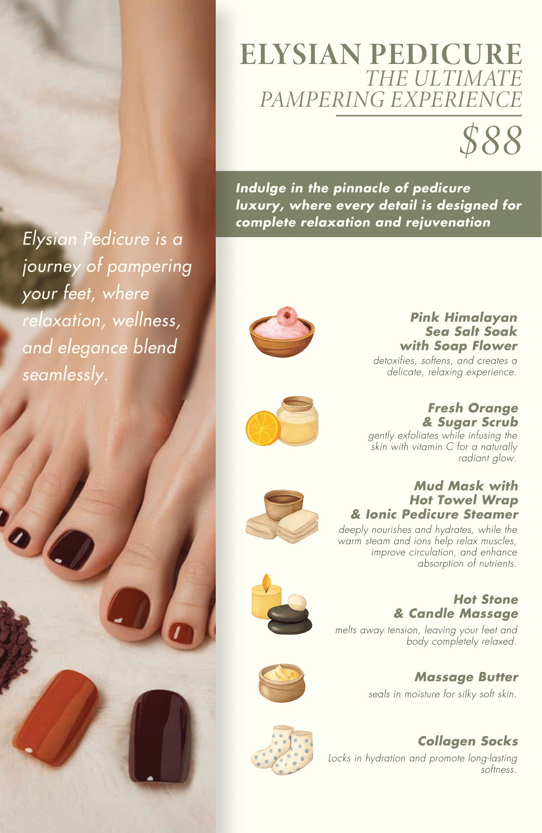 All services include a relaxing foot soak, nail trimming & filing, cuticle care, heel scrub, and your choice of polish.